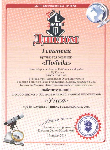 17.04.2013 - Диплом I степени во Всероссийском образовательном турнире школьников "УМКА".